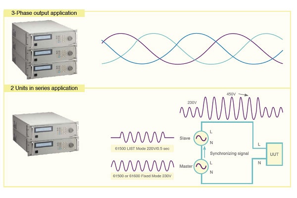 Chroma 61502可编程交流电源可以使用三台, 在三相模式的同步机制下, 串联成三相电输出使用. 或使用两台做高压(300V-600V)输出应用, 搭配LIST模式可进行瞬间高压450V/0.5秒的测试, 如图.
