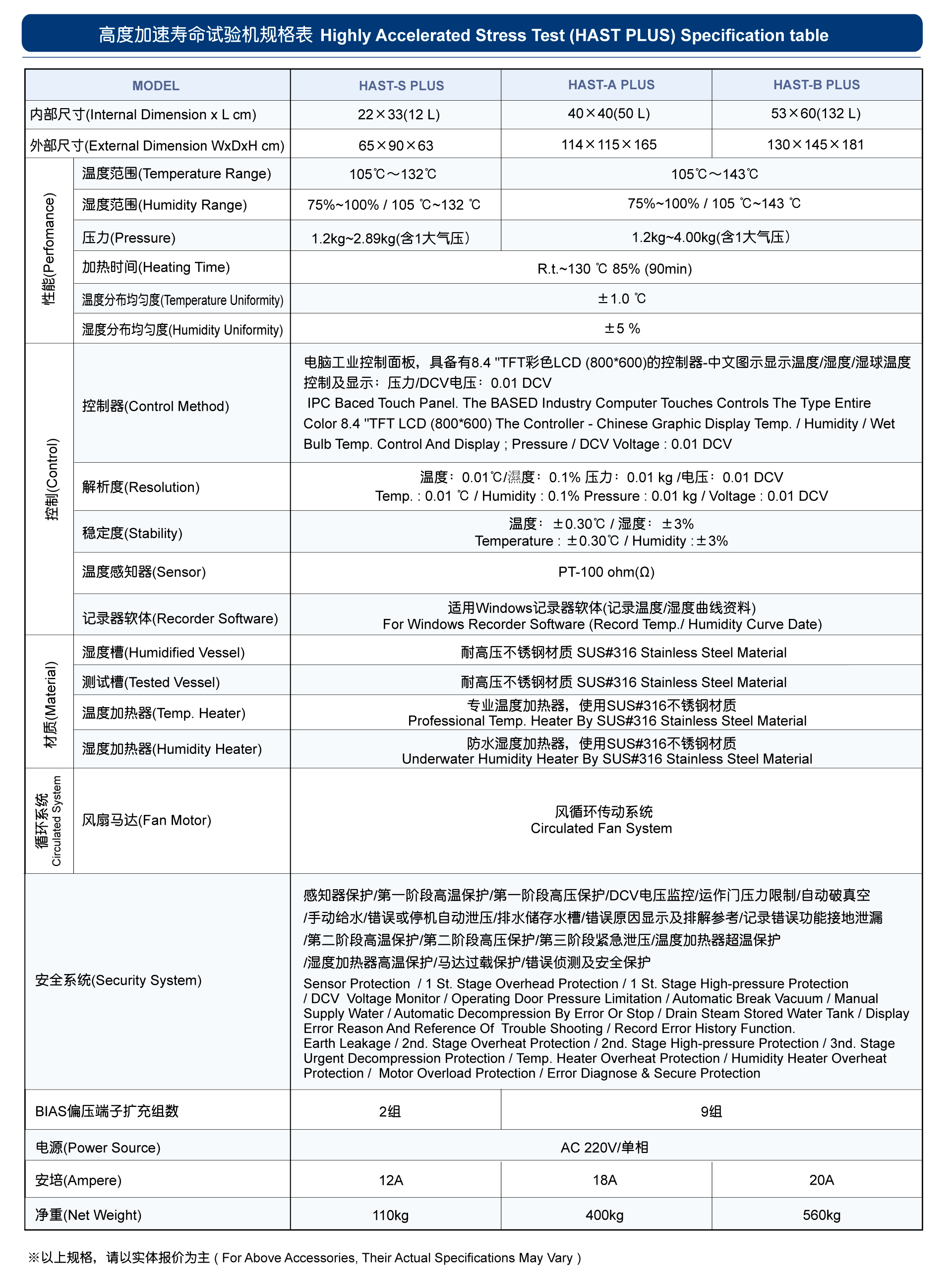 • 保护待测品的时序装置&BIAS电压端子:符合JESD22-A110之实验规范要求,模拟待测品在高温、高湿环境下,加载最大工作电压,检测内部封装模组材料接合与保护层的渗透,并且观察是否造成迁移。