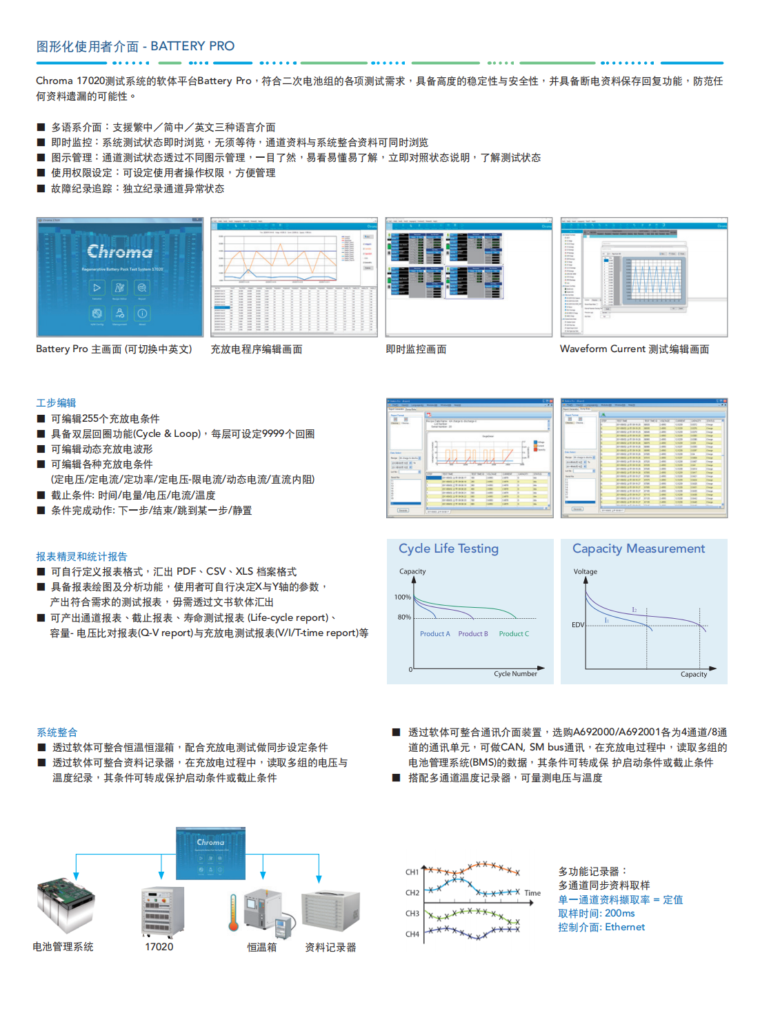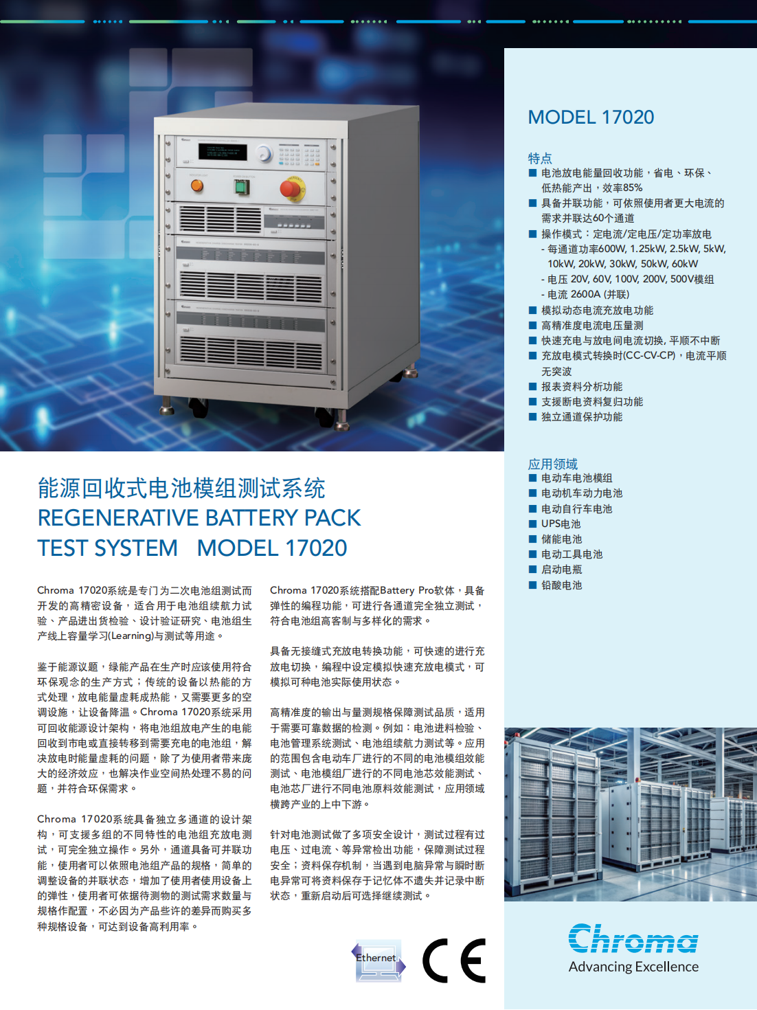 Chroma 17020系统是专门为二次电池组测试而开发的高精密设备,适合用于电池组续航力试验、产品进出货检验、设计验证研究、电池组生产线上容量学习(Learning)与测试等用途。