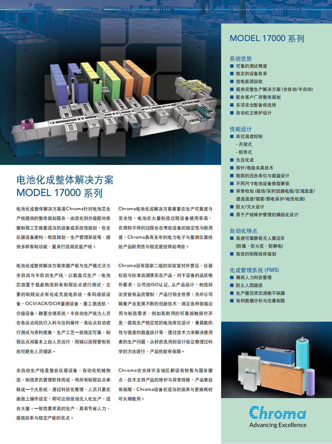 电池化成整体解决方案是Chroma针对电池芯生产线提供的整体规划服务,由活化到分级配对依据制程工艺做最适当的设备或系统性规划,包含仪器设备建构、物流规划、生产管理系统等,提供多样客制功能,量身打造高效益产线。