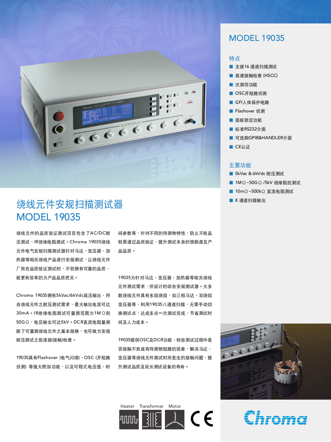 Chroma 19035绕线元件电气安规扫描测试器针对马达、变压器、加热器等相关绕线产品进行安规测试,让绕线元件厂商在品质验证测试时,不但拥有可靠的品质,能更有效率的为产品品质把关。