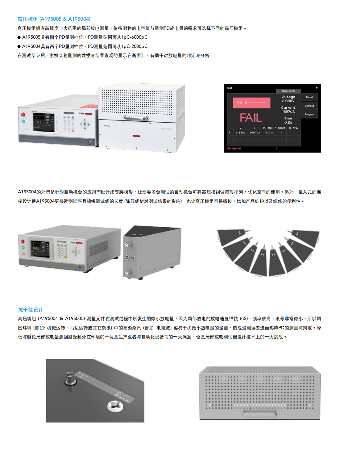 Chroma 19501局部放电测试器可提供交流耐电压测试(Hipot Test)测量待测物上的漏电(Leakage Current)与电气闪络(Flashover),以及提供局部放电(Partial Discharge,PD)测量待测物上局部放电的电荷量(pC)对高压元件与高耐压的绝缘材料进行交流耐电压与局部放电测试,可确保产品的绝缘品质与提升产品的可靠度。