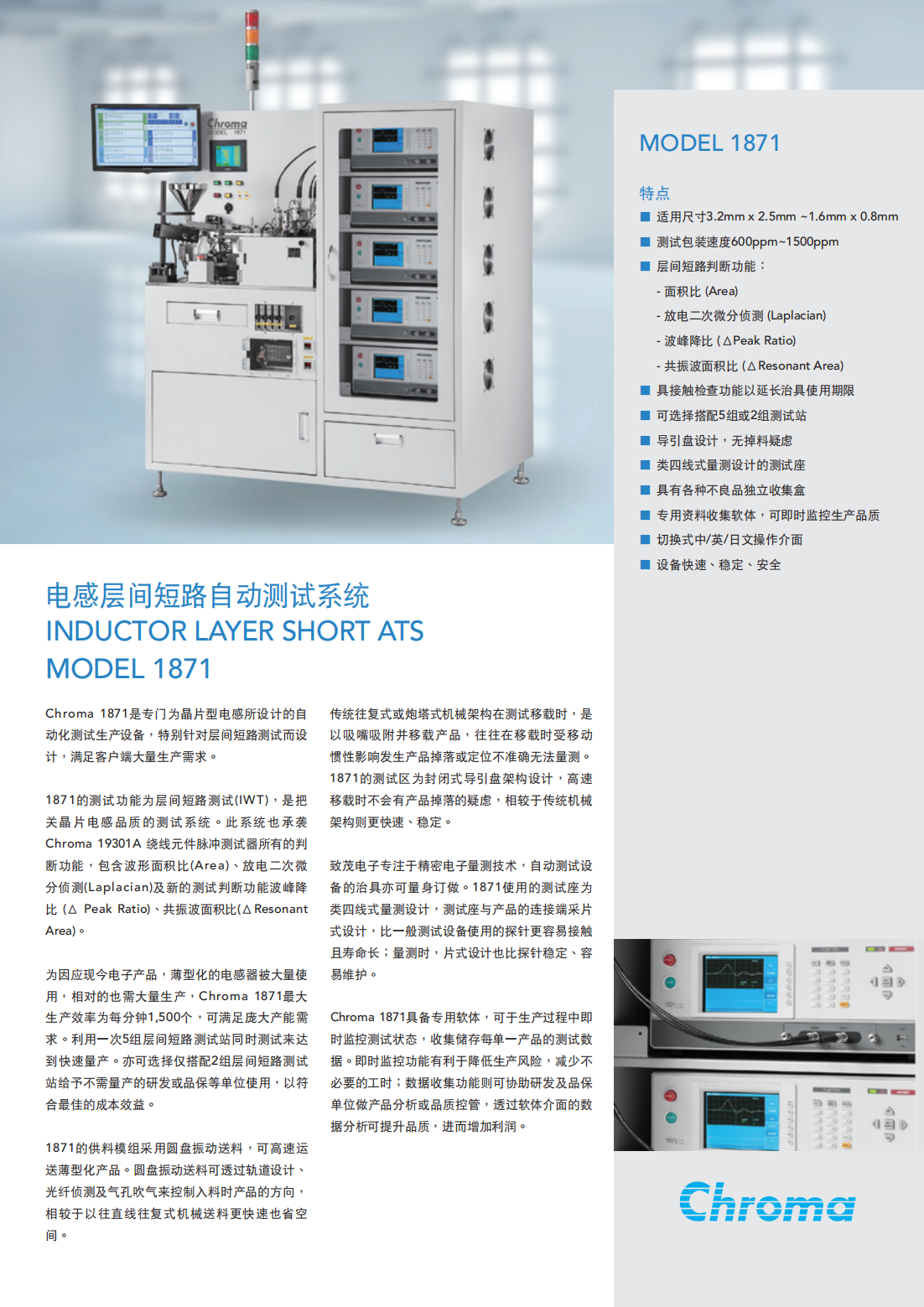 Chroma 1871是专门为晶片型电感所设计的自动化测试生产设备,特别针对层间短路测试而设计,满足客户端大量生产需求。